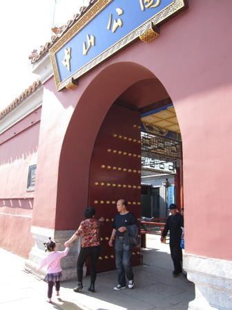 金色の鋲が9つ並んでいますね。「9」は「久」と同じ発音なので、中国語ではめでたい数字だといわれています。9つの鋲は、扉の格は最高レベル、すなわち皇帝にかかわりのある扉ということになるわけです。